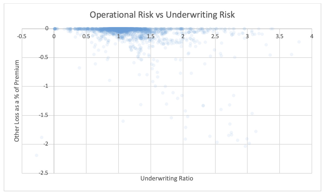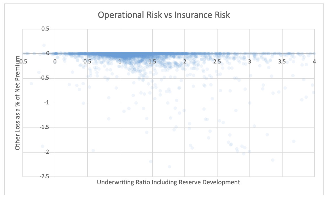 Operational and strategic risk are represented by the ratio of negative “Ins Other Income and Expenses” divided by earned premium. According to S&P, other revenue and expense amounts consist of “other noninterest income and nonrecurring revenue minus nonrecurring expense” (S&P Global 2025). These usually result from a company’s strategic decisions, i.e., gain realized when selling a subsidiary or division, or one-time charge as a result of layoffs. Larger amounts are detrimental to the company.