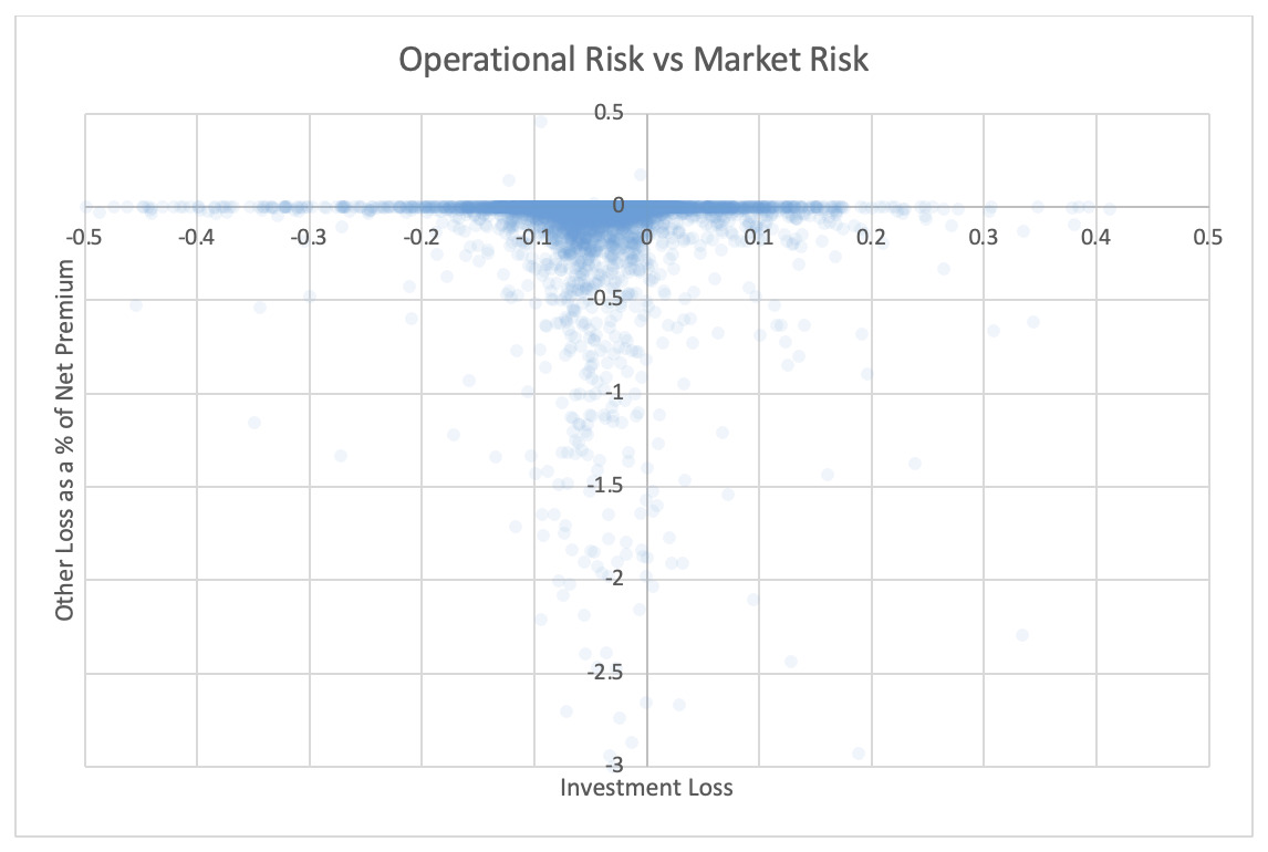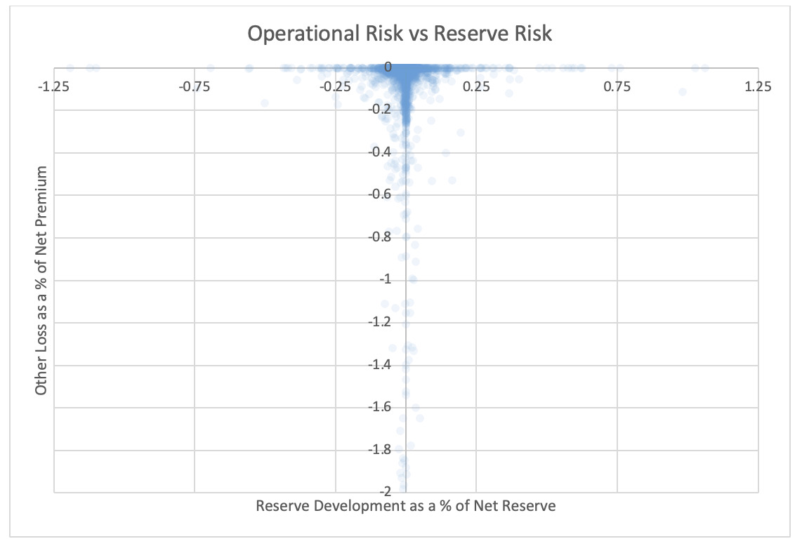 Scatter plots were used to examine whether tail loss events exhibit certain associations that may behave differently around the mean (see Section 5). The Risk Working Group analyzed these plots and noted that the only noticeable tail correlations were between operating risk and underwriting risk and operating risk and insurance risk.