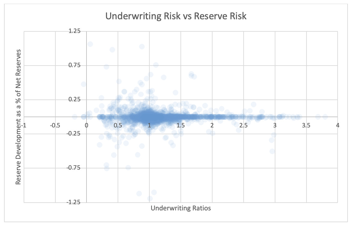 Underwriting risk for the purpose of this study is the risk of an underwriting loss in the current year. It does not include adverse reserve development from prior years; however, it does include current year catastrophe risk. The data used to study correlations in this study cannot explicitly differentiate losses due to catastrophe from losses due to non-catastrophe events. Therefore, for the purpose of this study, underwriting risk includes catastrophe risk. This study represents underwriting risk by the ratio of the sum of current year incurred losses and the acquisition expenses divided by earned premium. A larger ratio is detrimental to the insurance company.