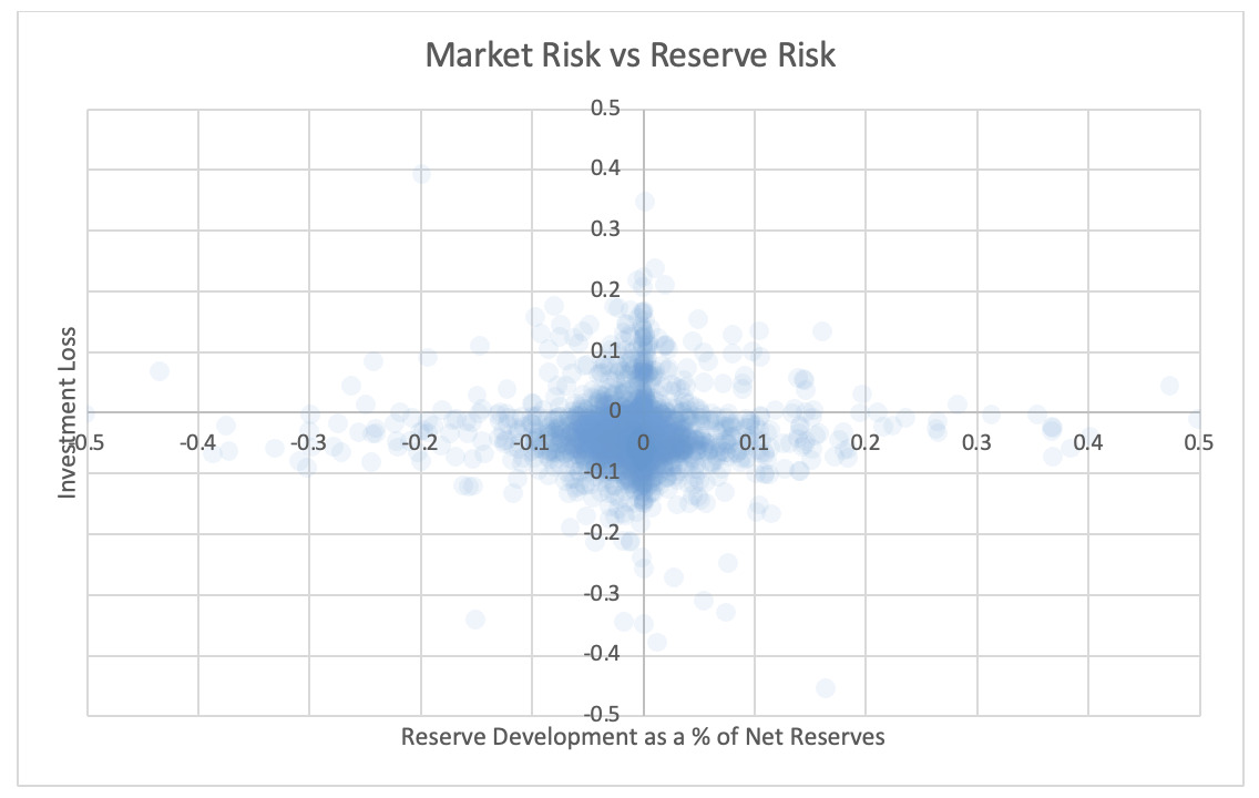 Correlation could be measured at many levels, one of which is the aggregated correlation across the entire industry. If the industrywide reserve development is tallied over 30 years and compared with industrywide market returns, this would generate an industry-level empirical correlation factor between reserve risk and market risk. However, industry-level correlation factors should not be applied to individual companies, largely because of diversification between results of different companies. A better benchmark is the correlation between comparable companies of similar size, asset mix, and underwriting portfolio.