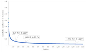 Since there is nothing magical about a specific CV, another way to consider a target value is depicted in Figure 1, which shows the target value’s relationship to policy count. The function is a power curve, dropping precipitously through the first 100 or so policies. On this basis, it could also be argued that 50 to 100 policies significantly ease the book’s growing pains, thereby helping it to attain scale.