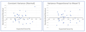 Using the auto severity example, we can look at the residual plots for two very different variance structures. On the left we have the residuals assuming variance is constant for all severities (Normal); on the right are the residuals assuming variance is proportional to the square of the expected severity (Gamma). While there is some evidence of heteroscedasticity in the graph on the left, it is not entirely clear that one assumption is superior to the other.